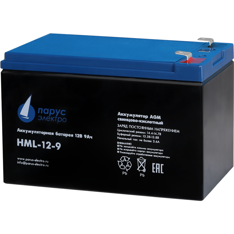 Свинцово-кислотные аккумуляторные батареи «Парус электро» серии HML длительного срока службы с высокой цикличностью изготовлены по технологии AGM (электролит, связанный в стекловолоконном мате с дополнительными сепараторами). Благодаря утолщенным пластинам с высококачественными решетками из свинцово-оловянно-кальциевого сплава имеют увеличенный срок эксплутации. При этом использование в производстве очищенных материалов высокого качества обеспечивает низкий саморазряд АКБ. Аккумуляторы серии HML имеют срок службы до 12 лет.